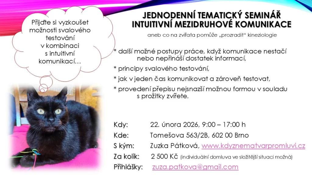 Dalším možným nástrojem práce může být kineziologie, která ve spojení s komunikací dokáže pracovat se zvířetem a jeho naprostou individualitou. Seminář je věnován těm, kteří s kineziologií začínají nebo ji vůbec neznají, tzn. bude to seminář úvodní.