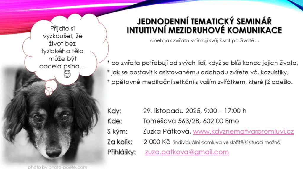 Dovoluji si Vás pozvat na tematický jednodenní seminář věnovaný intuitivní komunikaci se zvířaty zaměřený na odchod zvířat z fyzických těl.